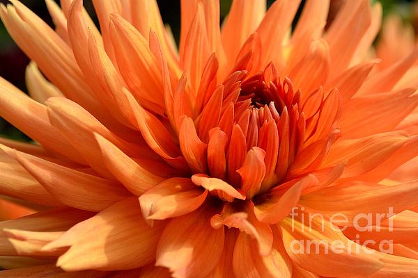 A close up shot of an orange dahlia flower in the summer sun.